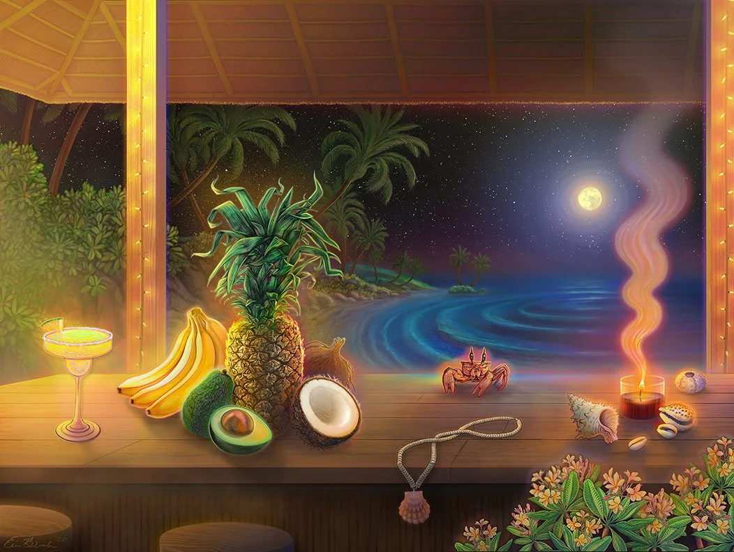 Inspired by a particularly vibrant bouquet of flowers that I bought at the Harvard Square Farmers’ Market a few years back, the south-facing bay window of the kitchen in my old apartment, and my two trouble-making cats, Apollo and Eevee. Special guest appearances by some of my favorite houseplants, some very juicy citrus, a feisty praying mantis, and a few local butterflies that frequent the back yard at my new apartment.