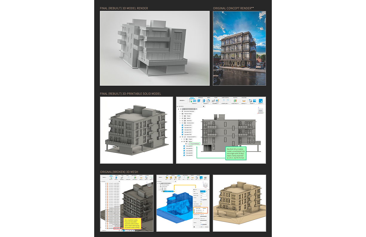 Complete rework of 3D model to prepare model for 3D printing. Original .obj file provided to me was not water-tight/manifold (reverse normals, duplicate faces, etc.). Model was too broken to be repaired by Fusion 360’s repair tools, so I converted the salvageable mesh groups into BREP (solid), and used the Solid and Surface workspaces to reconstruct the remaining features. Additional modifications made at the base of the model to make it a more stable 3D print.